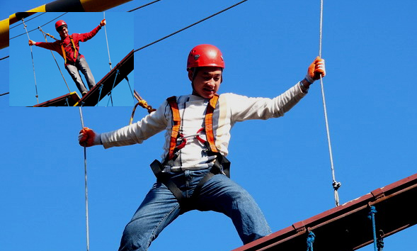 每个学员都必须登上8米高的吊板(共3块)。每块板下方由多人控制绳索以保证吊板平衡。其他学员在下面努力稳定木板,最终共同到达成功到达另外一边.