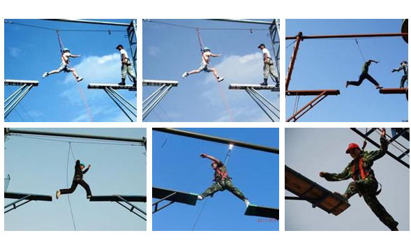 参训队员爬越 9米高的断桥立柱,站立于断桥桥面之上,两臂自然平伸,保持身体平衡,移步至桥面一侧边缘,以后脚的蹬力,使身体向前跃出,跨过断桥落于桥面另一测,平稳走到终点。